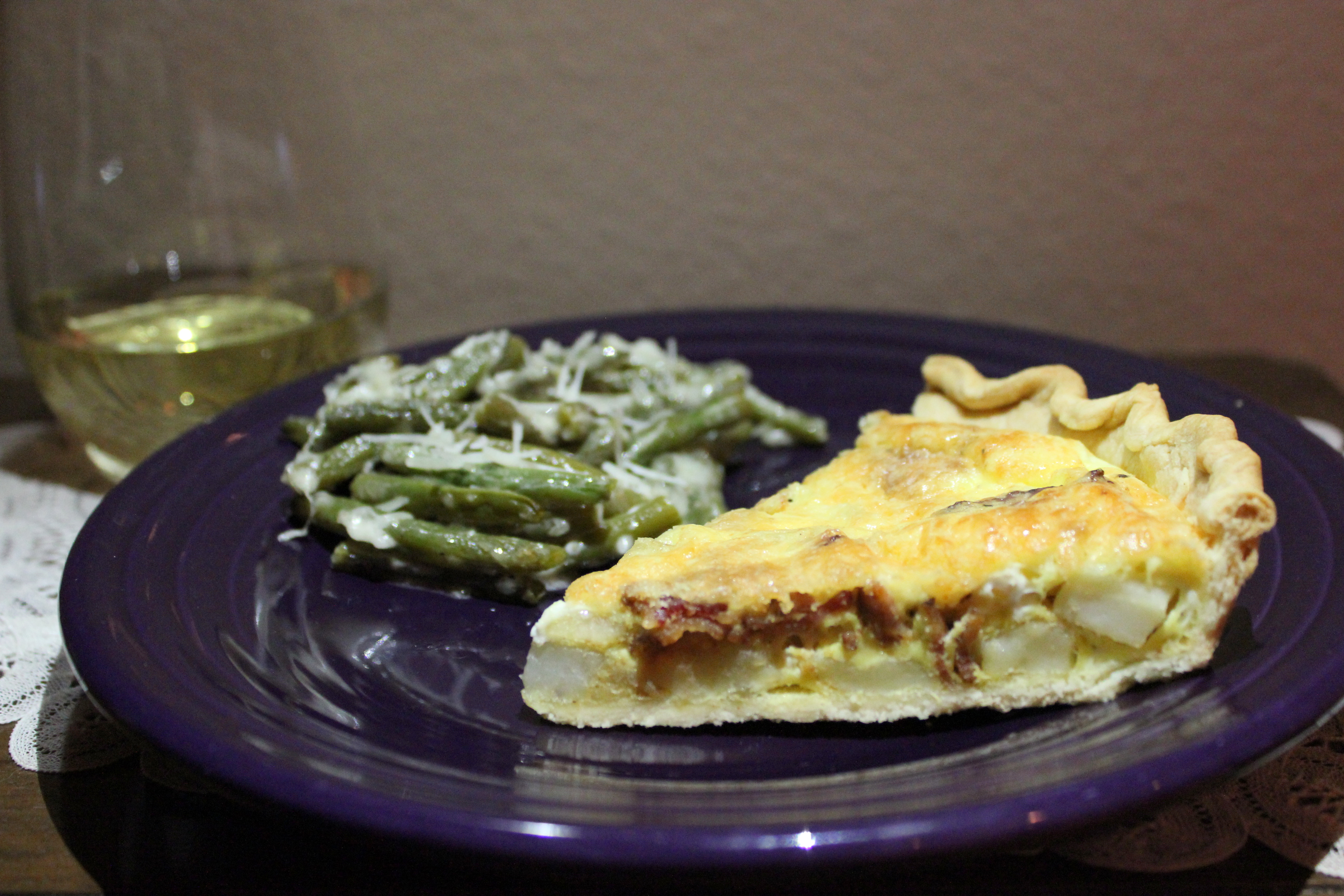 For tonight’s recipe, I looked to my freezer – hmmm, a few hashbrowns left in a bag, some bacon – only needed to get a pie crust. Deliciousness followed. Brett declared that I would win a quiche-baking contest with this, which was very sweet. As a side dish I did Creamy Baked Green Beans. Yes, if you click on the link the recipe is actually for asparagus, but I do the same thing with green beans (1/3 the price of asparagus) and it is quite tasty. And we had some green beans from the farmers’ market. Add some white wine, and there’s an easy dinner with French flair.