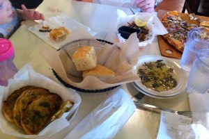 Our table was very full which was a little difficult since we have to keep an arm-length radius clear around Hannah. (sorry for the bad phone pics) The pizza was good, we like thin crusts, and the fried zucchini was also tasty. Hannah had some of everything we ordered. The garlic bread was okay, but again sort of a waste of money because you get the free focaccia. And it was plenty of food; we had almost half the pizza left over.