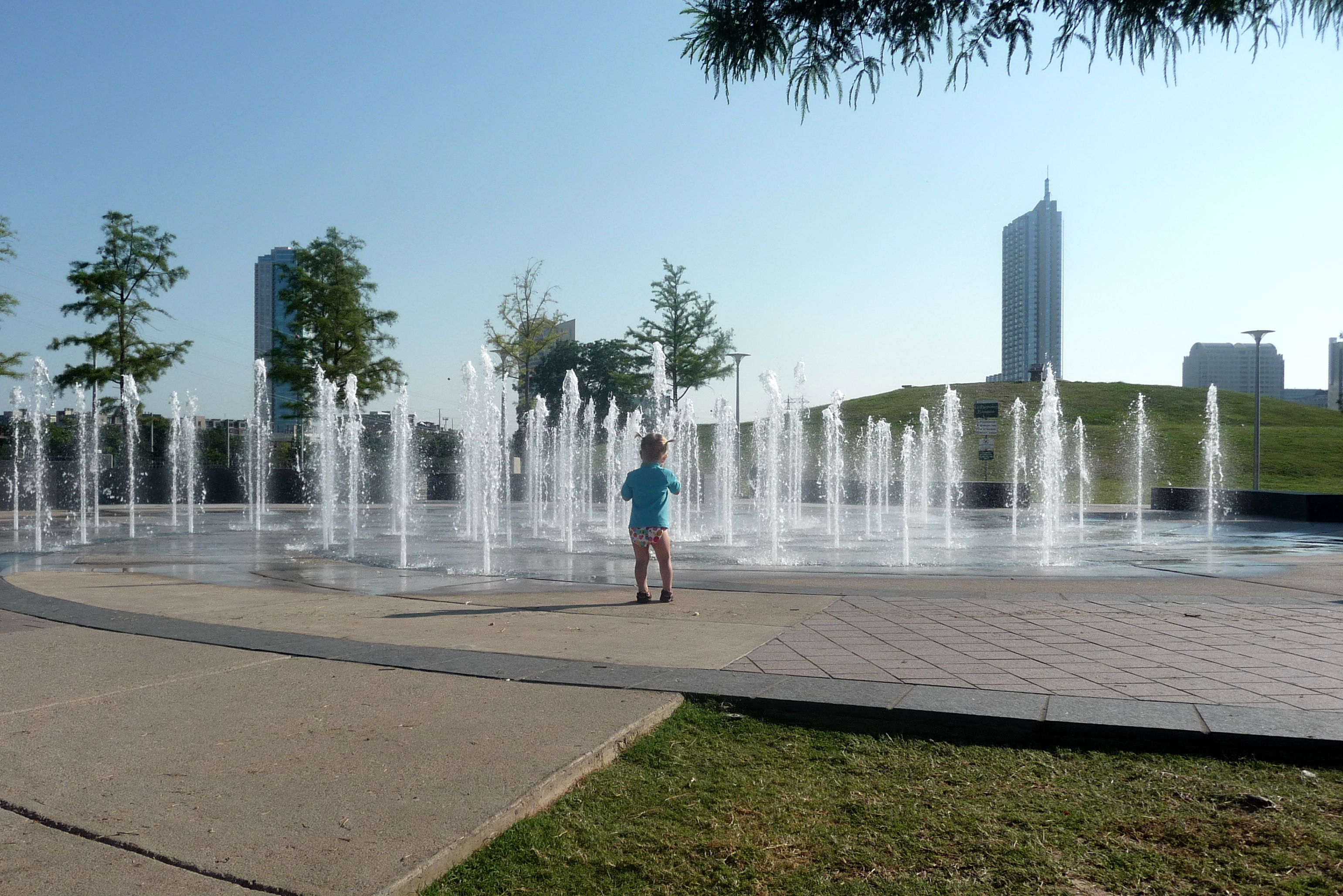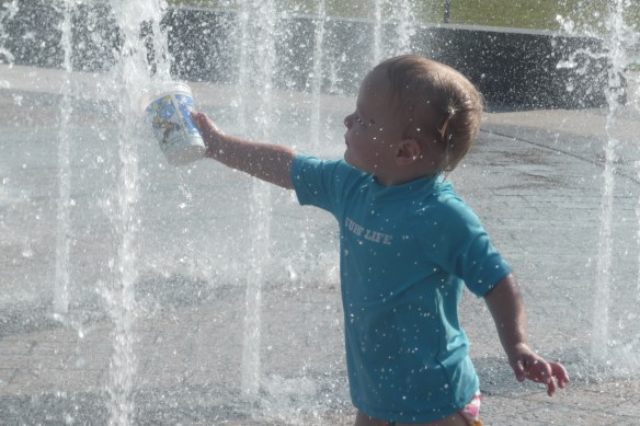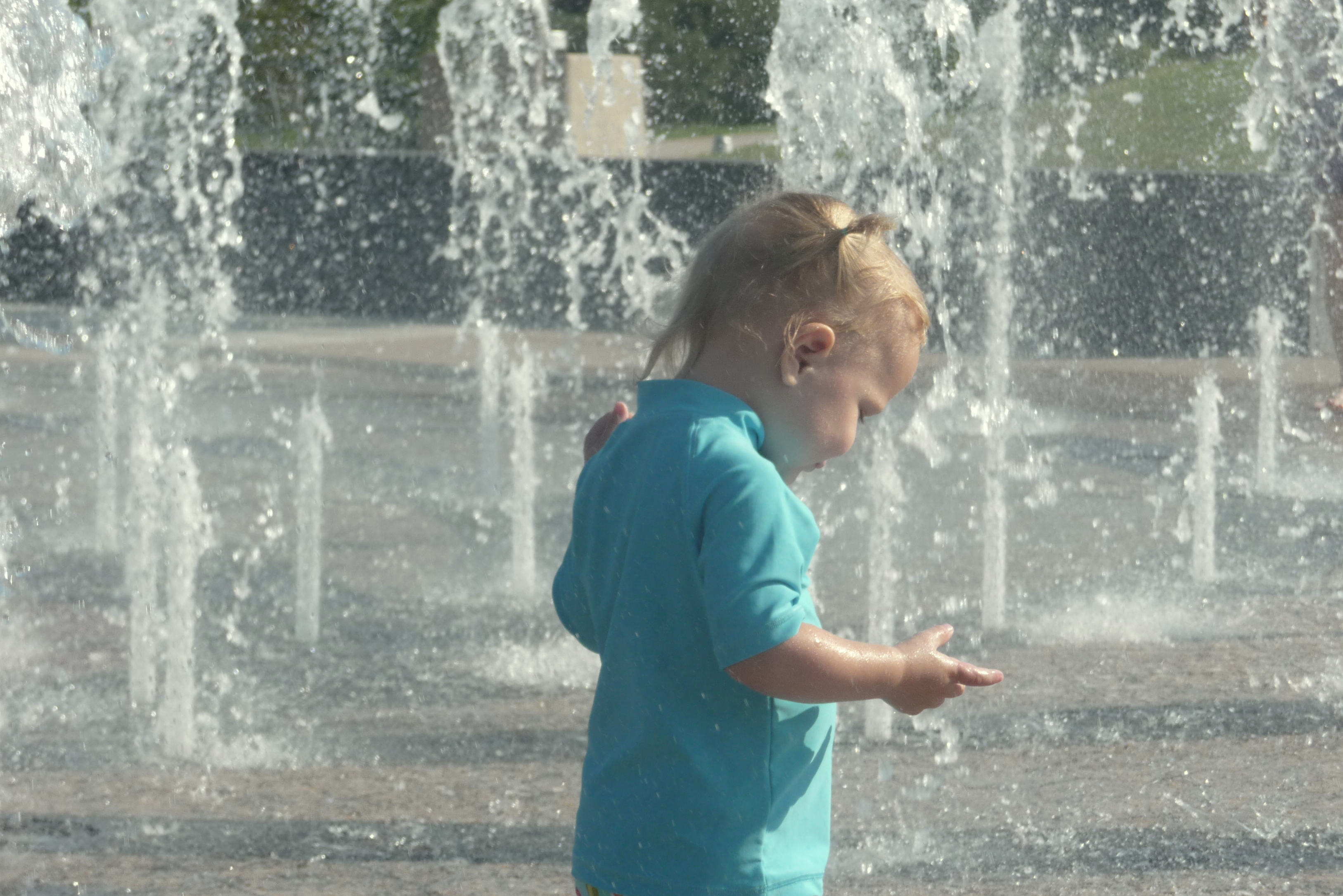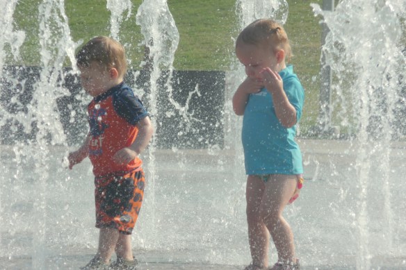 This morning, Meghan and I tried out a fountain/splash pad area downtown. It’s easy to find, just turn in at Doherty Arts Center and park in the lot behind. Then look for the fountain.