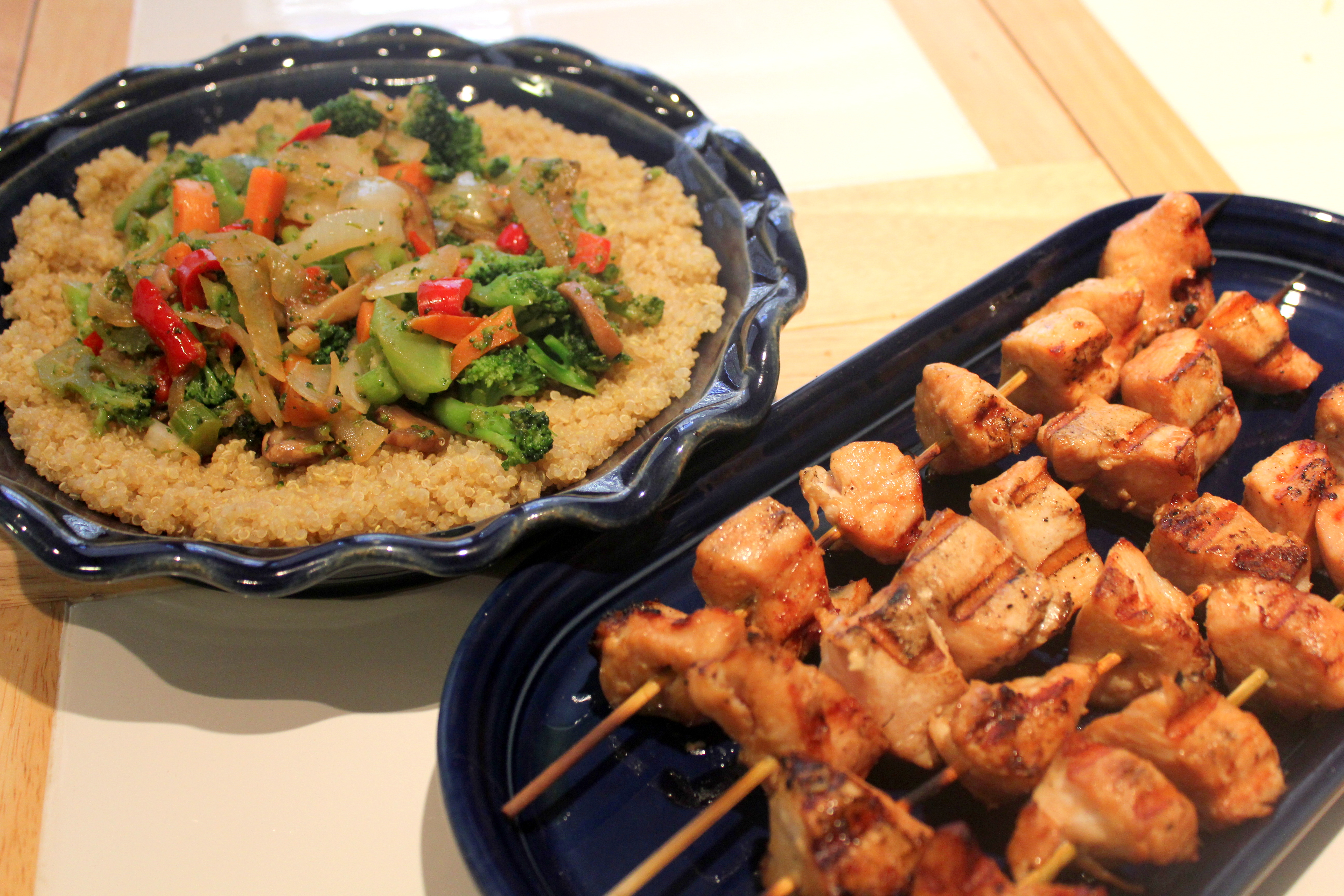 Today I looked at my plan which only said: “chicken skewers, quinoa.” Not very descriptive, so I had to get my creative juices flowing to fill out the meal. Mid-afternoon, I cut up the chicken to marinate. I had many seasonings on hand, so I was faced with a lot of possibilities: go Mexican with lime juice and fajita seasoning, go Italian with some bottled salad dressing, go BBQ with our favorite Stubb’s sauce, or go Asian with a soy and ginger marinade. I chose the latter as I had some ginger in the freezer to use up.
