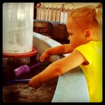 Our favorite spot so far is the McKenna Children’s Museum. Kay’s family has a year-long pass, and we’ve been able to join them twice (yay Groupon deals!). Last week, we enjoyed smaller crowds since school has started and there were no field trips. Just moms and toddlers. There are lots of fun areas – hospital, train set, log cabin, kitchen, camp site, grocery store, art room, space station and water play area. It was a blast!
