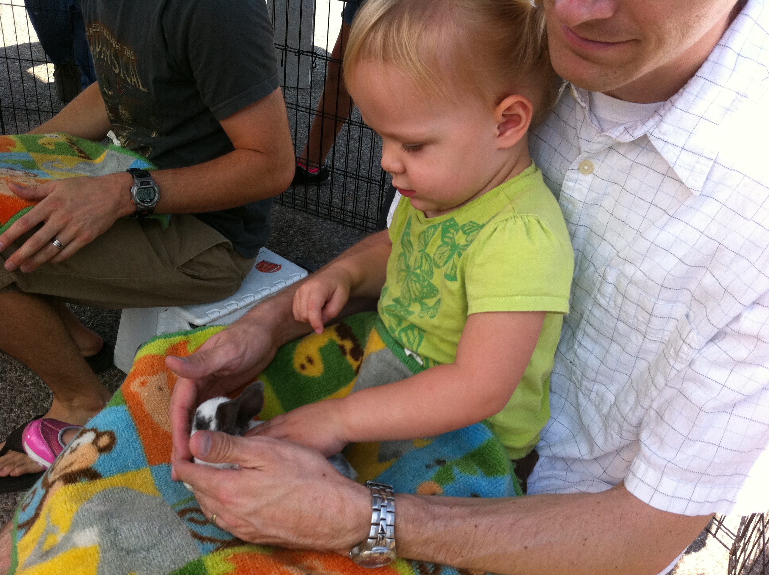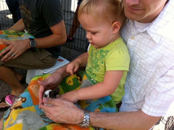 We spent all morning shopping for a new refrigerator. Hannah did great, and we rewarded her with a stop at the Farmer’s Market animal tent. She happily petted the bunnies and guinea pigs, even a very calm chicken.