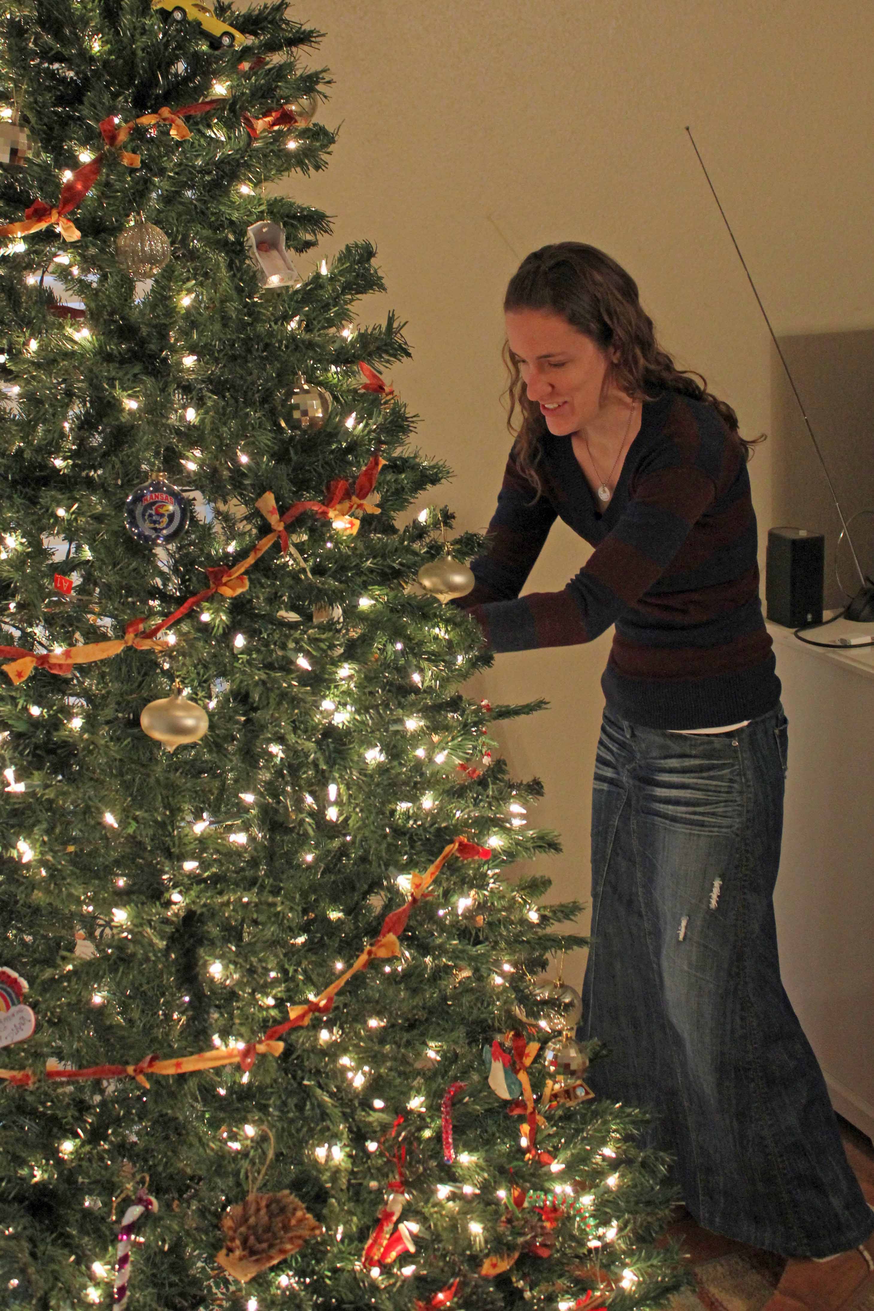 Hannah liked to put all the ornaments in a toddler-level row.