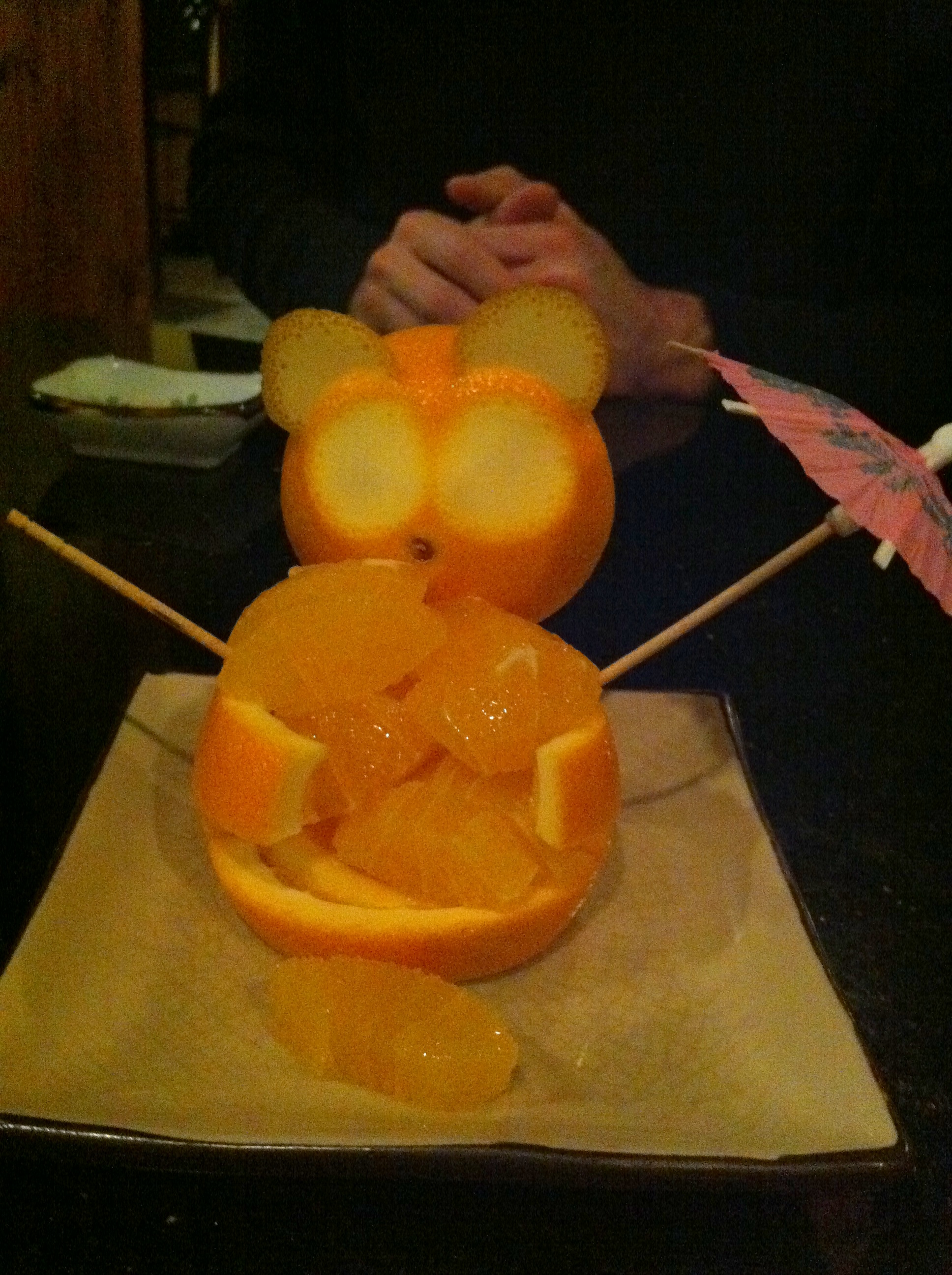 Partway through the meal, Hannah announced to our waiter that she loved him. He came back with an orange carved like a panda bear holding neatly-segmented orange slices. Amazing!
