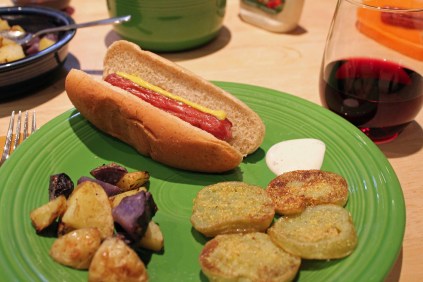 This was grilling night, and Brett did hot dogs and our CSA potatoes (white and purple!). We also tried some “alcohol-removed” wine. Not a winner.