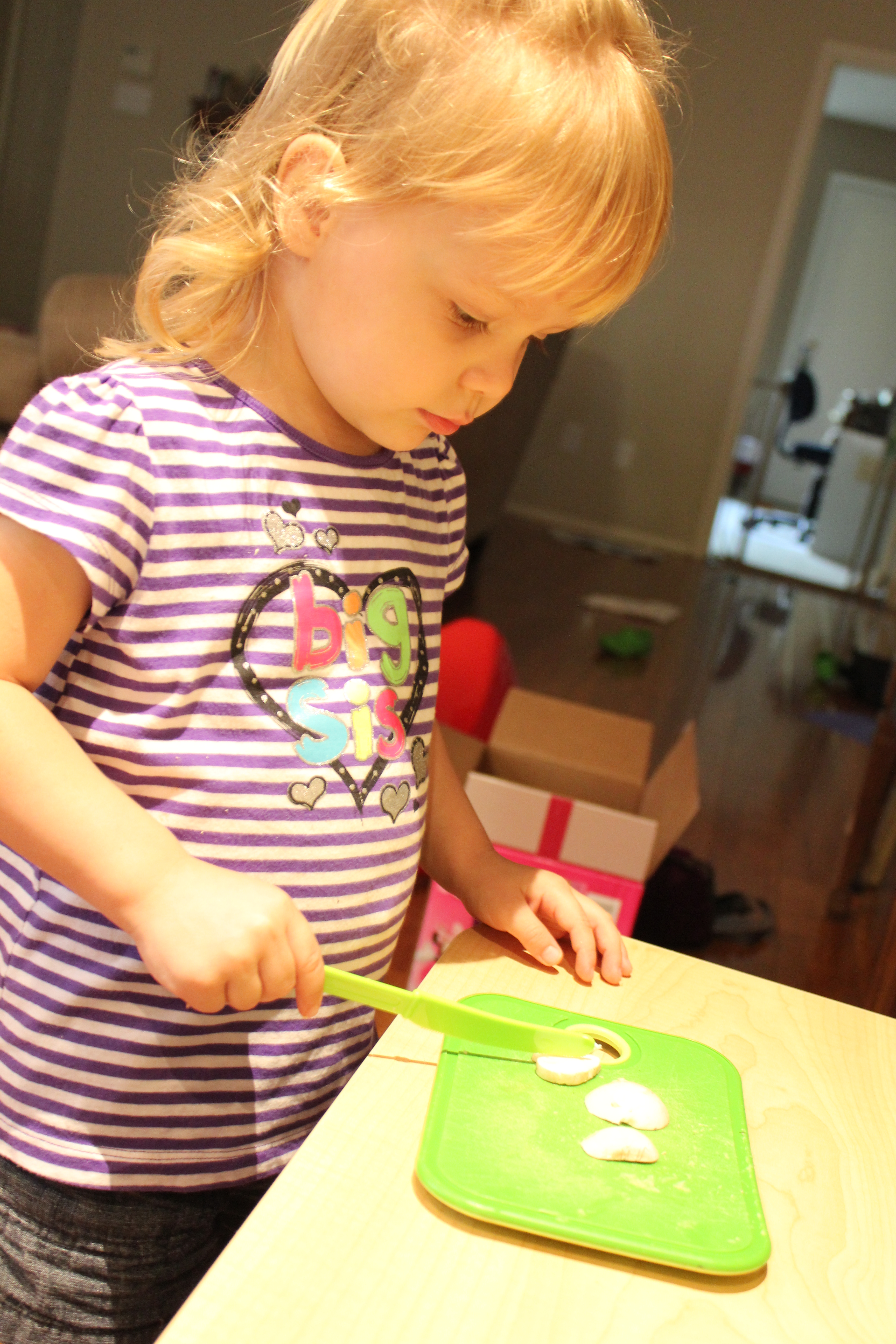 Another meal this week was a steak and mushroom stir-fry with a ginger soy sauce. Just used onions from our CSA box, but I had to take this picture of Hannah helping me cook. She helped me wipe off the mushrooms, then I set her up with this little cutting board and a plastic knife. It wasn’t sharp enough to actually cut anything, but she loved this!