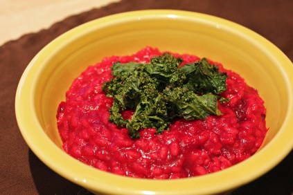 The beets – I roasted them the last two times so I wanted to do something different this week. I roasted them whole, pureed them, and did a beet risotto. I’m finding risotto is like stir-fry or quesadillas – you can throw anything random in it.