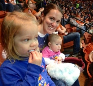 So we decided to make it a family outing. Taking a 3-month-old who will only breastfeed and 3-year-old with a penchant for bolting to a 16,500 person arena requires some planning. We gave ourselves plenty of time and were able to park in a garage with a very short walk. Then we got a lunch of exciting concession food: hot dogs, nachos, Coke (which we even let Hannah drink) and cotton candy.