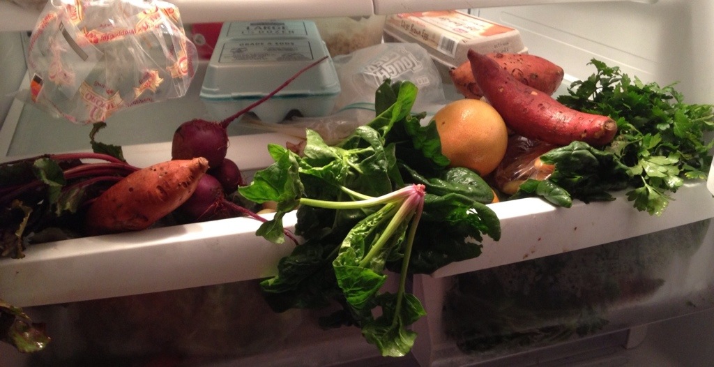 We got our CSA box today, and Hannah was very proud that she carried it in from the car and put everything away all by herself.