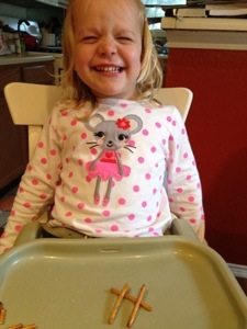 Hannah wanted to sit in the high chair seat for snack because she was pretending to be a baby. Then she proceeded to proudly create an “H” with her pretzel sticks on the tray. I tried to explain this was proof she is beyond the baby seat.