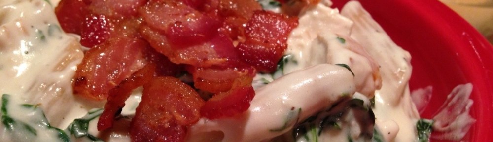 This is one of those non-recipes. I just put a few things together and didn’t exactly measure. I cooked some spinach and bacon. Brett grilled some chicken. I cooked some pasta and made a white sauce and added cream cheese. Then I mixed it all together, and we ate it. Hannah really liked this; penne seems to be her favorite pasta shape.