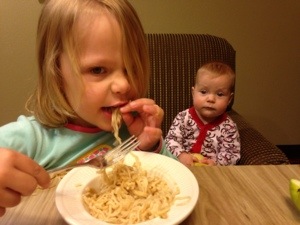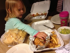 After dinner, we put Violet down and made popcorn while watching “Tangled.” We tried putting Hannah down, but she would not stay on her cot. We tried various things with no success and decided to just let her stay up. About this time, we all got really hungry. My attempt at a frugal and fun dinner just didn’t cut it. So Brett went out to get take-out from Chili’s.