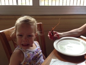 So everyone was looking at the crazy table with the crying gravy-hand baby and the preschooler suffering from some sort of crawfish amputation. We finally got everyone calmed down, and after a couple bites of the crawfish, Hannah decided she just wanted to play outside. Brett and I attacked the rest of the crustaceans while keeping Violet occupied with carrots.