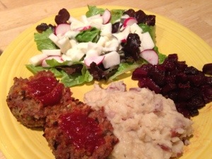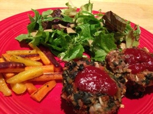 Instead of meatloaves, I like to make “meat muffins,” often with spinach or other vegetables in the mix. They are tasty and always a hit with Hannah, but they don’t look particularly appealing in a picture. I’ve tried shooting a couple different meals.