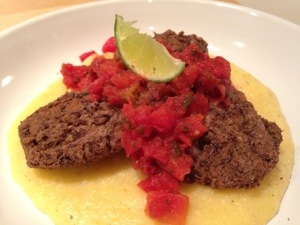 The taste was yum but the photo was blah. But more color doesn’t guarantee an appetizing photo. Check out my black bean cakes on polenta with a roasted tomato and green chile sauce.