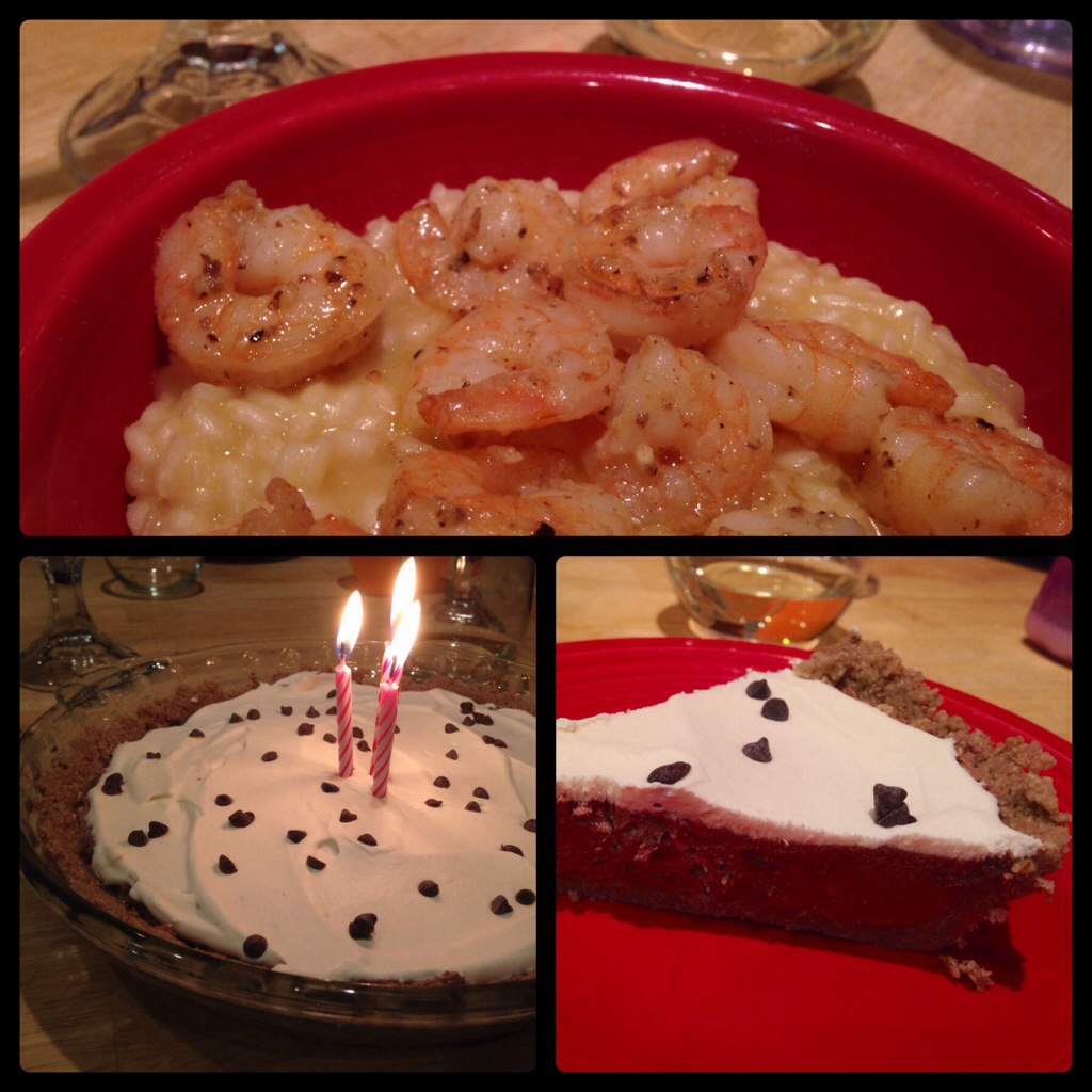 For my birthday dinner (because going out on New Year’s Eve is a little crazy), I made risotto and shrimp. For dessert, a chocolate cheesecake pie.
