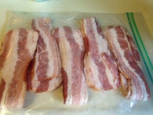 We had some bacon today, and I thought I’d share my bacon strategy. If I cook bacon as part of a meal, like with eggs, we usually use half the package. For the rest of the package, I take off 2-3 strips at a time and fold them over together then lay them flat in a freezer bag.