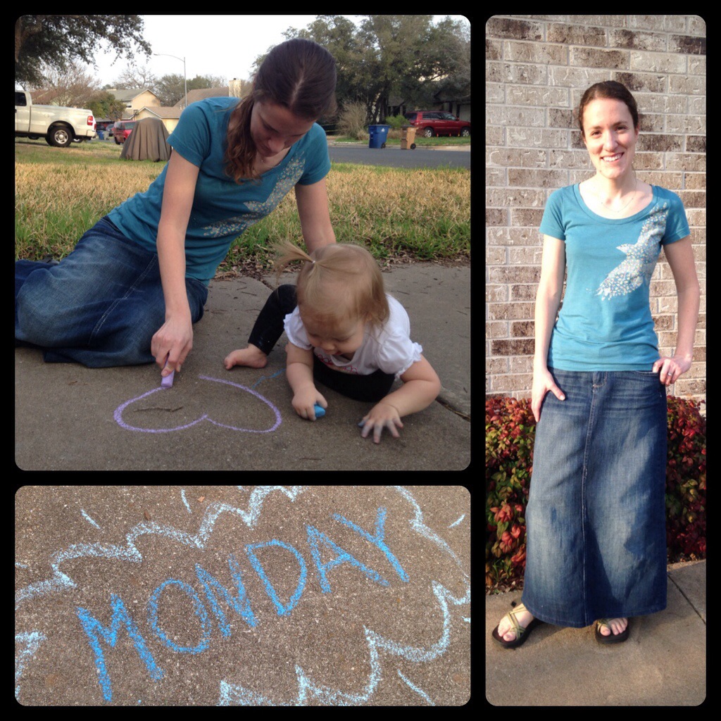 I am not a fashionista, I like to be comfortable. Please don’t look to me for style advice, this is just to show the possibilities and advantages of wearing real clothes. Most of these outfits are not any more work to put on than an old tshirt and yoga pants. (If you’d like some inspiration and practical tips to get in the habit of getting dressed, check out From Frumps to Pumps by Sarah Mae) I don’t think it’s vain or frivolous to spend a couple minutes each day on presenting yourself well. Even if you’re only presenting yourself to your husband and your kids, they’re worth it!