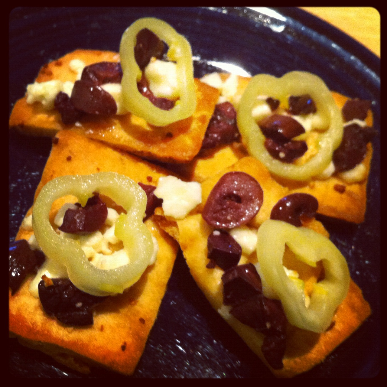 Greek nachos – To use up some of the leftovers from the pitas, I made up “nachos” for a fun appetizer for another meal. I laid out pita chips and covered them with feta and kalamata olives. After they were slightly baked, I topped them with some pickled banana peppers. Yum! Hannah really liked these. CSA ingredient: banana peppers.