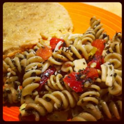 Simple supper first: roasted summer squash with whole grain pasta and lemon basil pesto.