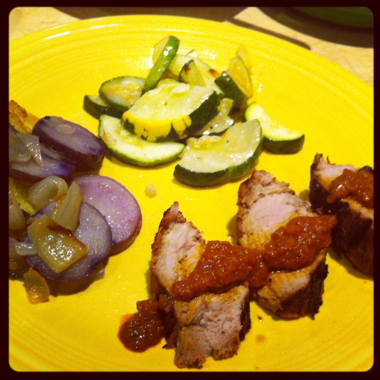 Grilling night – I marinaded a pork tenderloin in some barbecue sauce we got from a local guy at the farmer’s market, and we put extra sauce over the top. I put purple peppers, onions and purple potatoes in a foil wrap for the grill. We ran out of grilltop space, so I roasted the mixed squash in the oven. CSA ingredients: peppers, onions, potatoes, squash. I think the purple potatoes are especially fun.