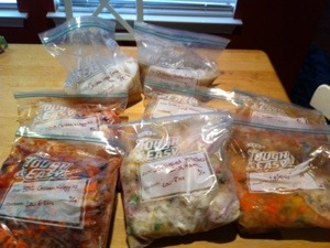 After assembling the veggies and sauces in the proper bags, I cut up 4 lbs of chicken breast and divided it between the recipes. Then everything was off to the freezer. From start the freezer, the prep and assemblage took me around three hours. Not too bad! Here are the finished, frozen meals.